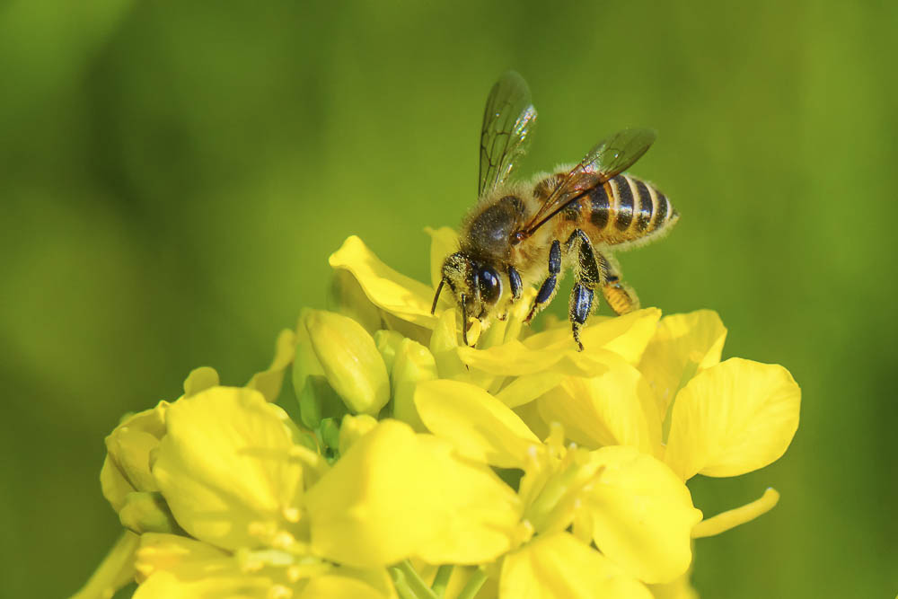 Honey Bee collecting pollen on yellow rape flower.